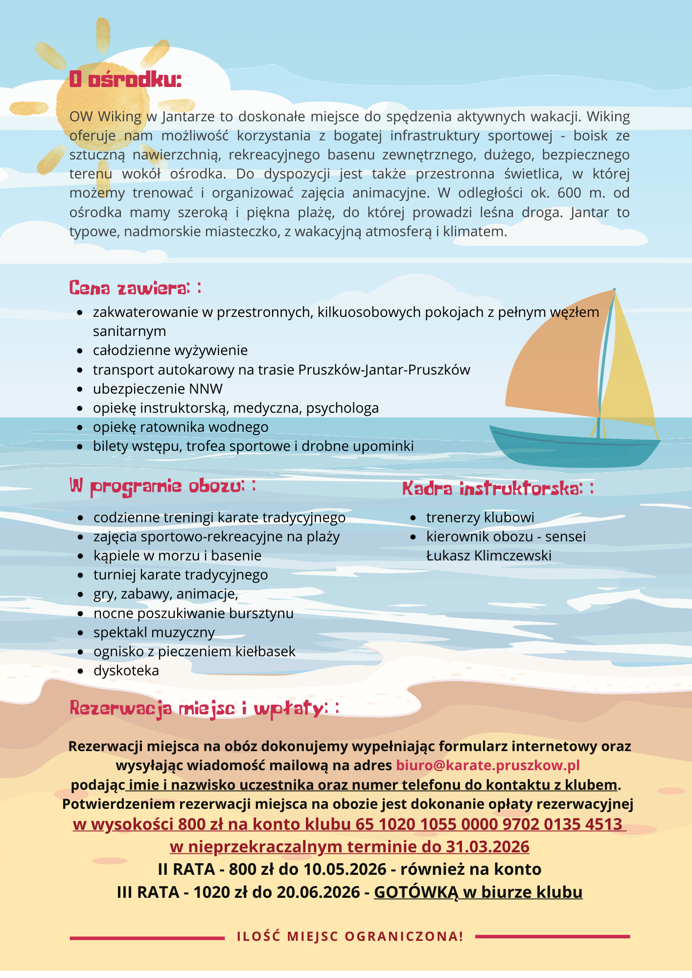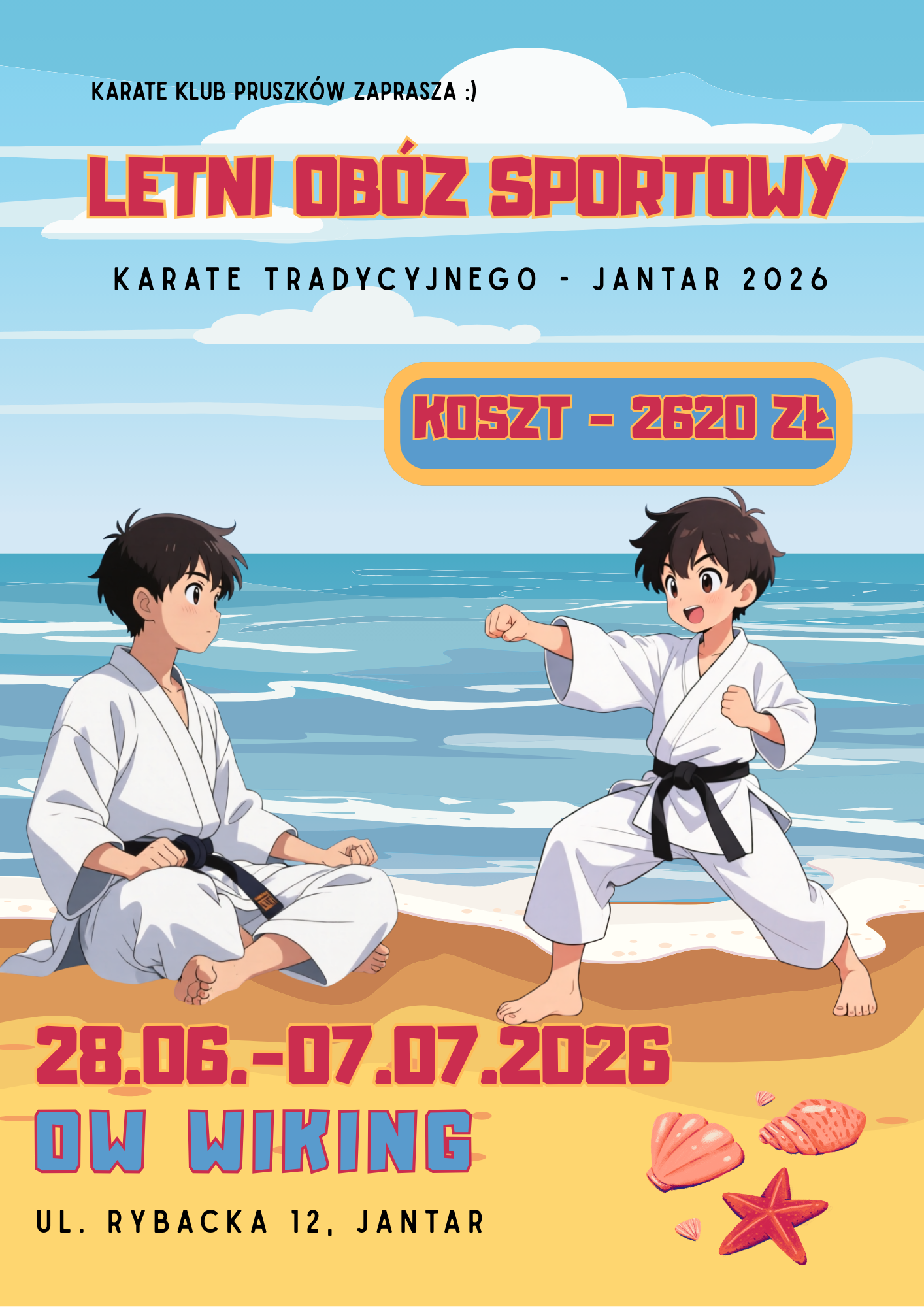 ruszyły zapisy na nasz klubowy letni obóz w Jantarze. Zapraszamy Was serdecznie do udziału w KARATE SUMMER CAMP. Jak zwykle będzie super aktywnie, będziemy trenować karate, ale będziemy także ODPOCZYWAĆ!!! Nie może być inaczej, jak tylko słonecznie, ciepło, więc będzie plaża, kąpiele w morzu, w basenie, wycieczki, gry, zabawy i ognisko z kiełbaskami.